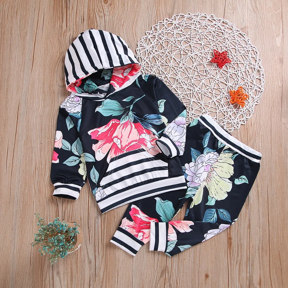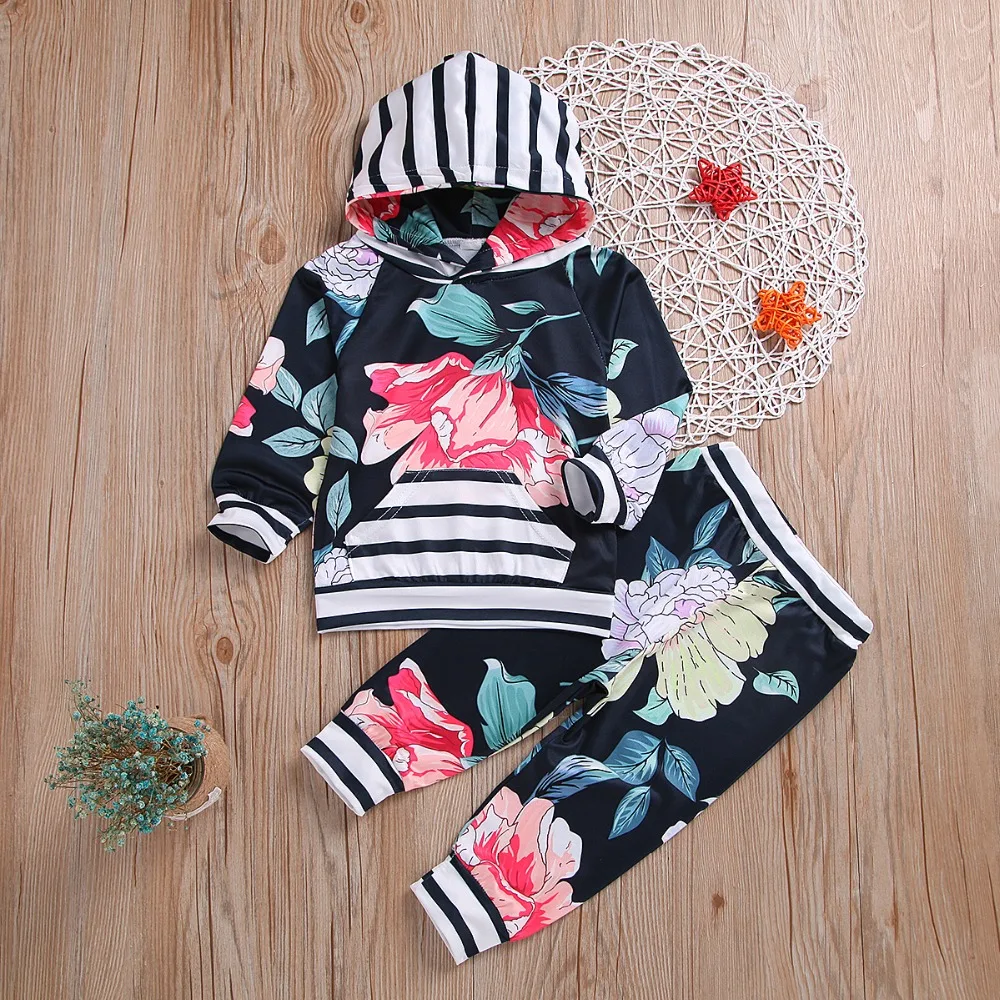 BEST Kid Baby Girl Clothes Set Floral Print Hooded Tops+Pant Long Sleeve Bebe Girl Children Clothes Set